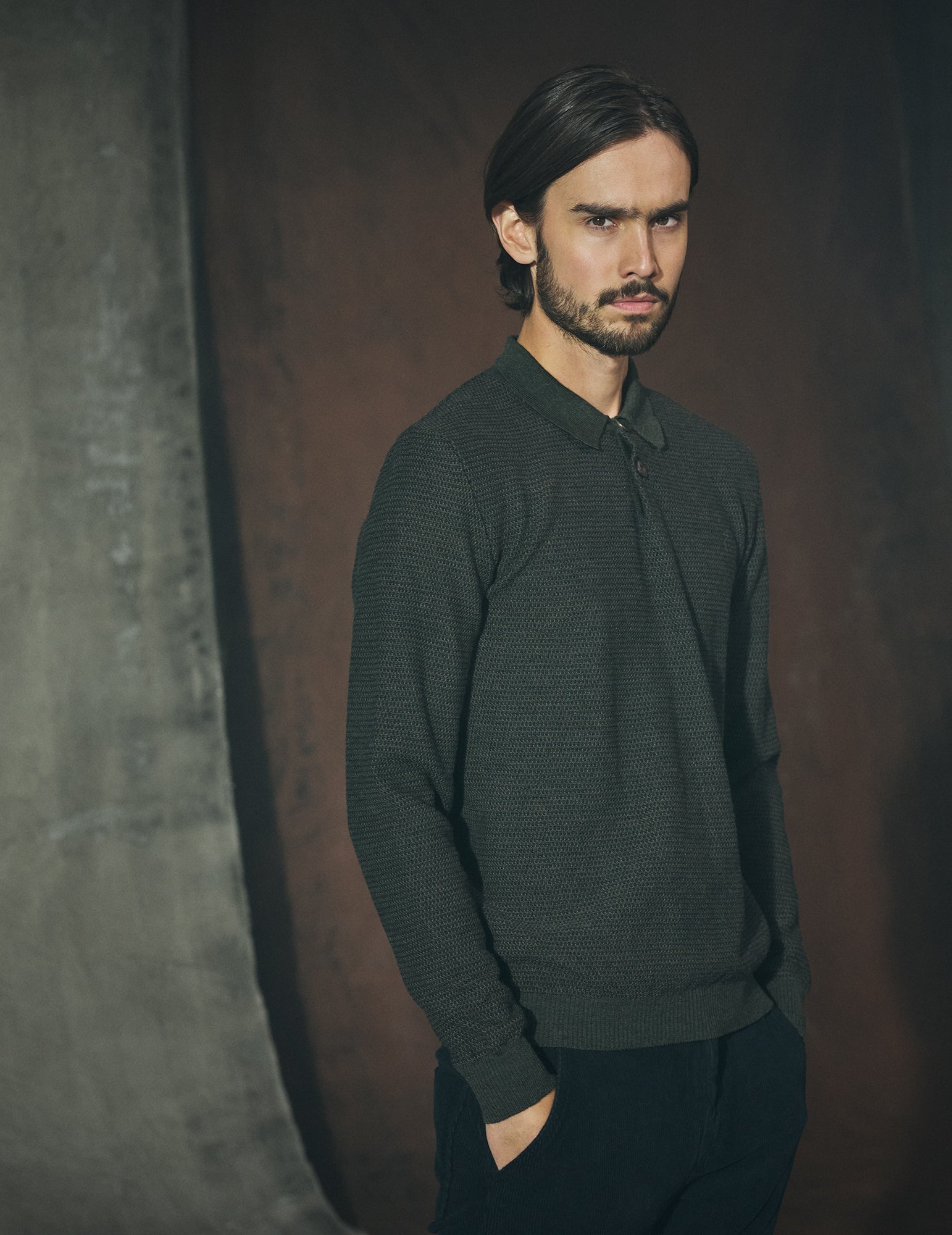 A knitted merino long sleeved polo shirt. Same fit as the Melar turtleneck.
