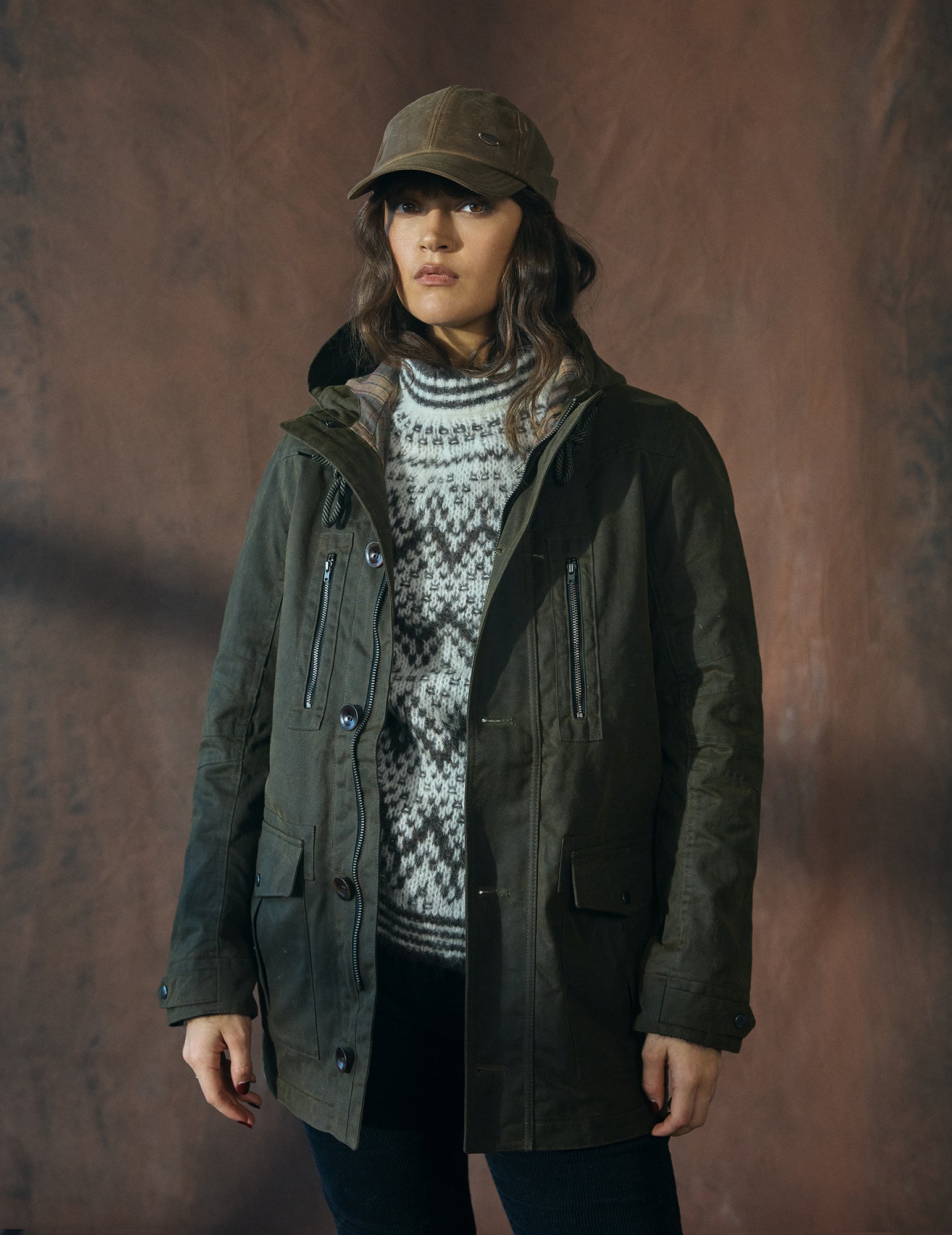 A hooded outdoor jacket, made of British Millerain waxed cotton. Water repellant and breathable.